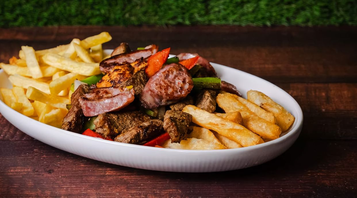 Carne, pollo, chorizo criollo, secreto, ensalada (lechuga, tomate y cebolla) y patatas o yuca