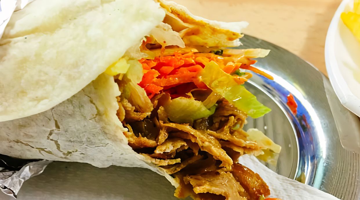 pan enrollado, un mezcla de carne y pollo, lechuga, tomate, cebolla y salsas