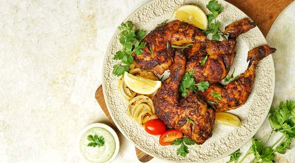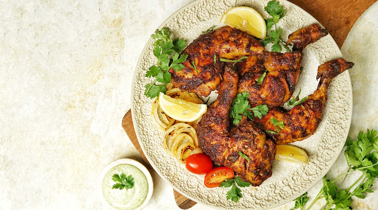 Pollo marinado con yogur, crema especial de la casa, ajo, jengibre, harina de almendras asada en horno Tandoori