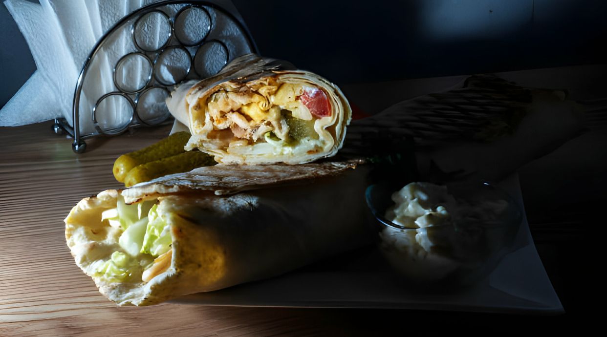 Carne kebab enrollada en pan plano con ensalada y salsas, estilo wrap