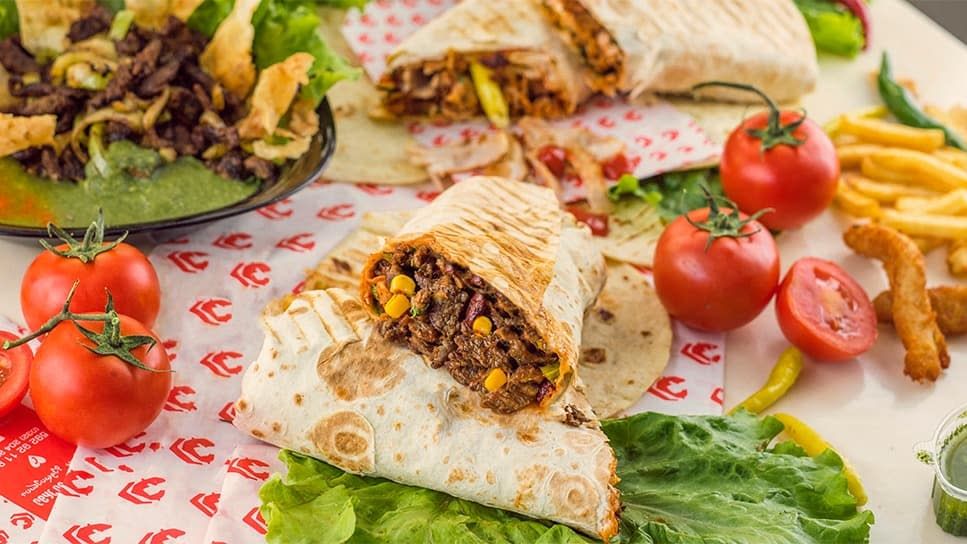 თხელი ლავაში, ფრი, ჰალაპენიო ზომიერად ცხარე, სალათის ფურცელი, პომიდორი, ხახვი, წიწაკა, კეჩუპი, სამარხვო მაიონეზი