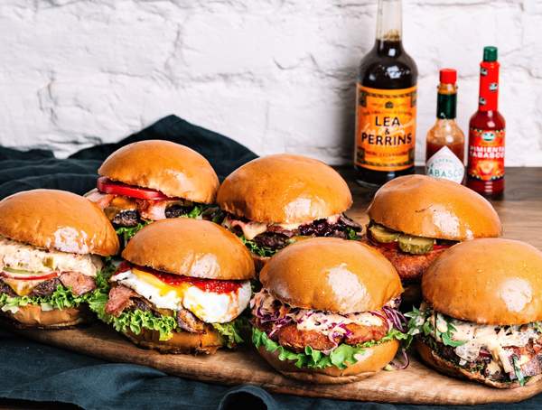 ფუნთუშა, საქონლის ხორცი, კვერცხი, ტკბილ-ცხარე სოუსი, საფირმო სოუსი, ბეკონი, ყველი ჩედარი, კარამელიზირებული ხახვი, აისბერგი.