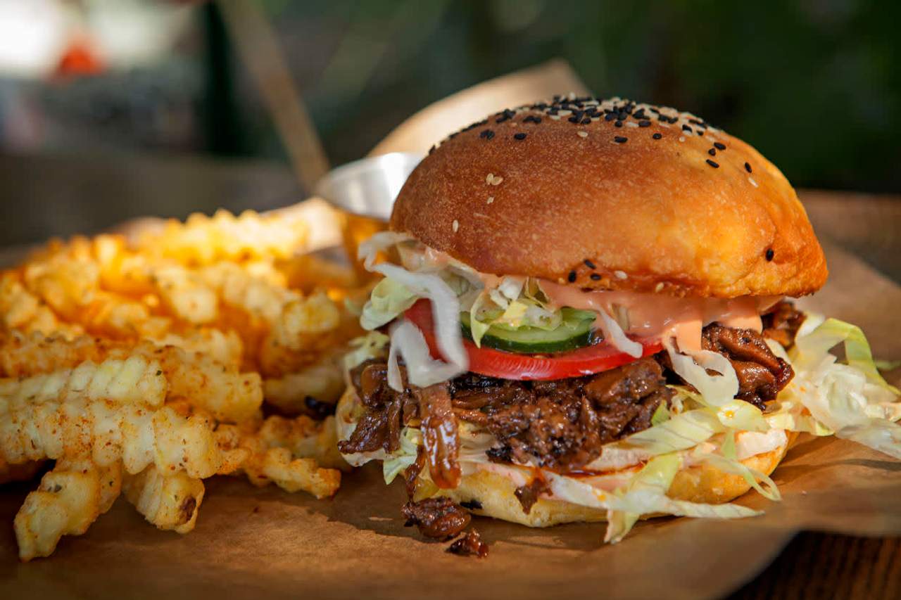 ფალაფელი, ბურგერის სოუსი, აისბერგის ფურცლები, პომიდორი, მჟავე კიტრი, კარამელიზირებული ხახვი, ჰალაპენიო, ტკბილი კარტოფილის პური