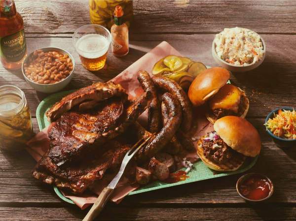 საქონლის ხორცის კოტლეტი, შებოლილი დაძენძილი ღორის ხორცი, ქოულსლოუ სალათა, ჩედარი, BBQ სპეც სოუსი