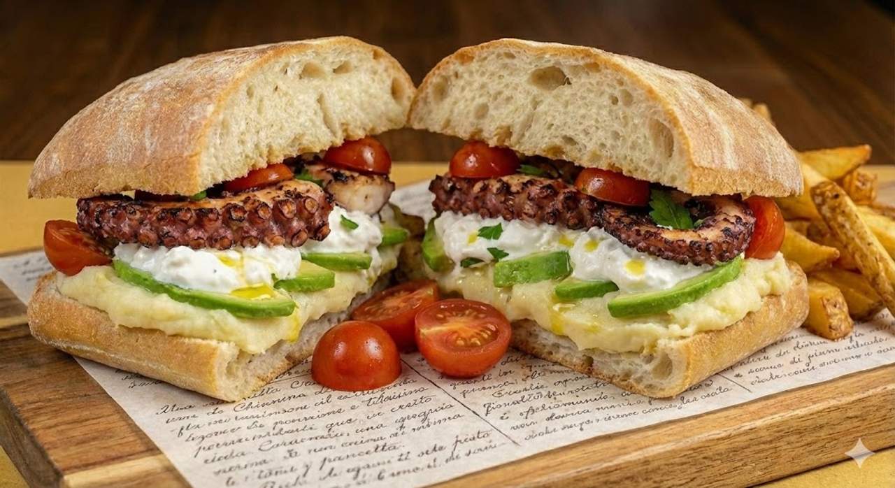 Polpo grigliato o salmone, crema di patate, avocado e stracciatella di bufala
