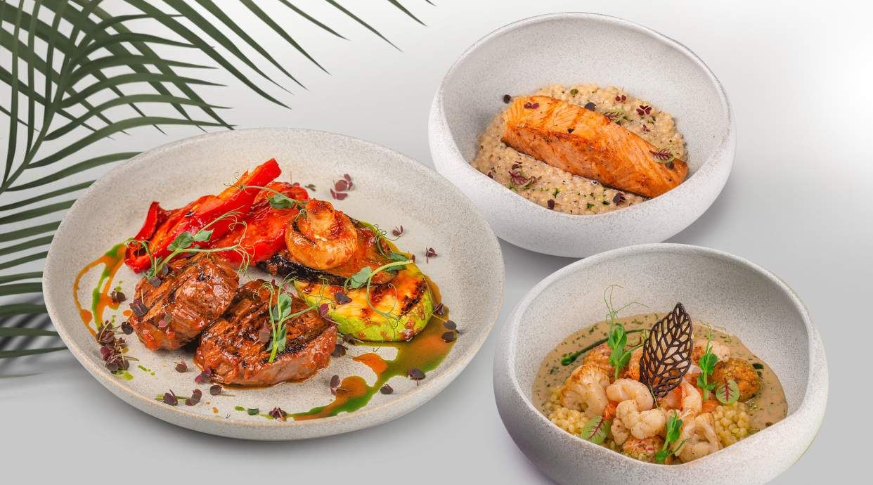 Сытное блюдо состоящее из свежих овощей, микс салата, курицей на гриле и отварным рисом