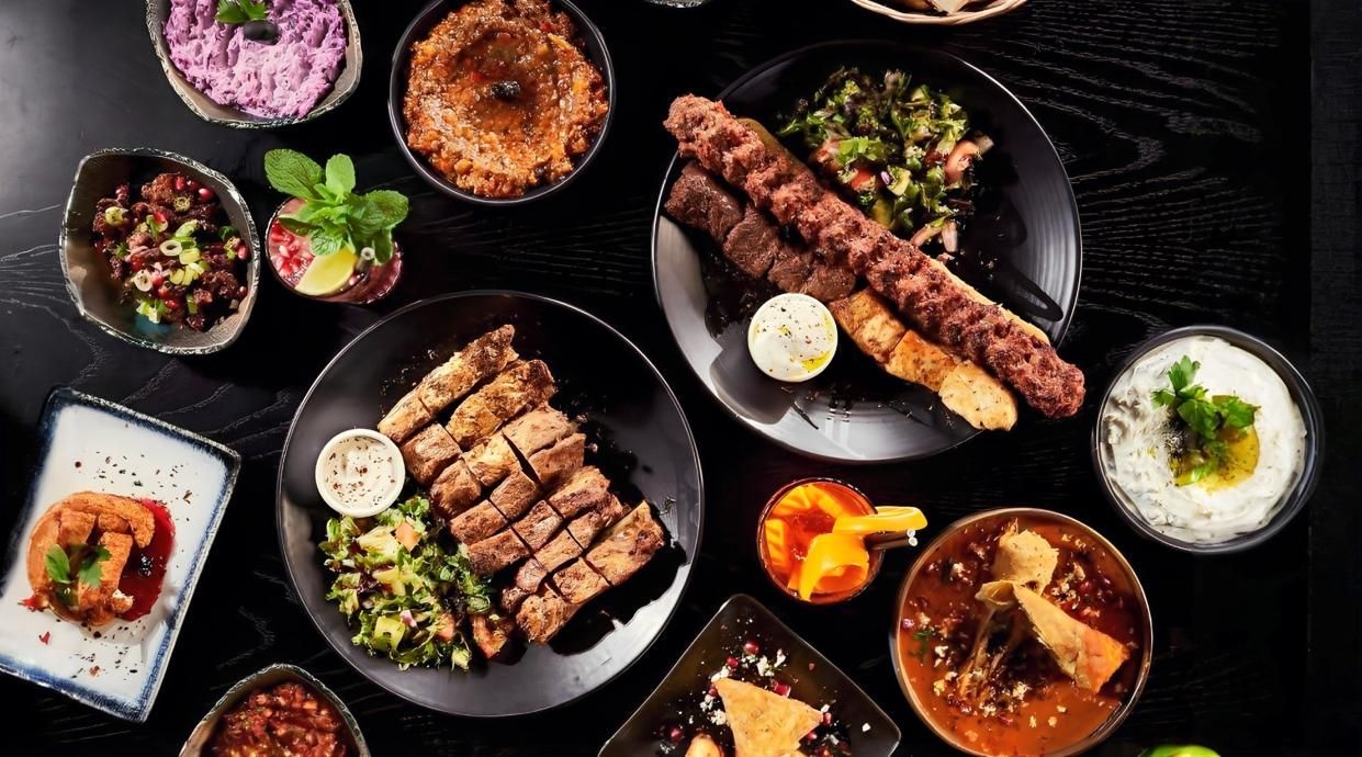 Ароматный и острый кебаб, приготовленный из маринованного мяса и специй, подается с сочными овощами, рисом и ароматным соусом