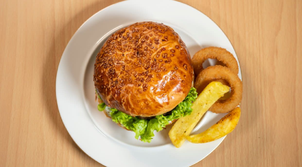 Булочка, котлеты из говядины, сыр, листья салата, томат, маринованный огурчик