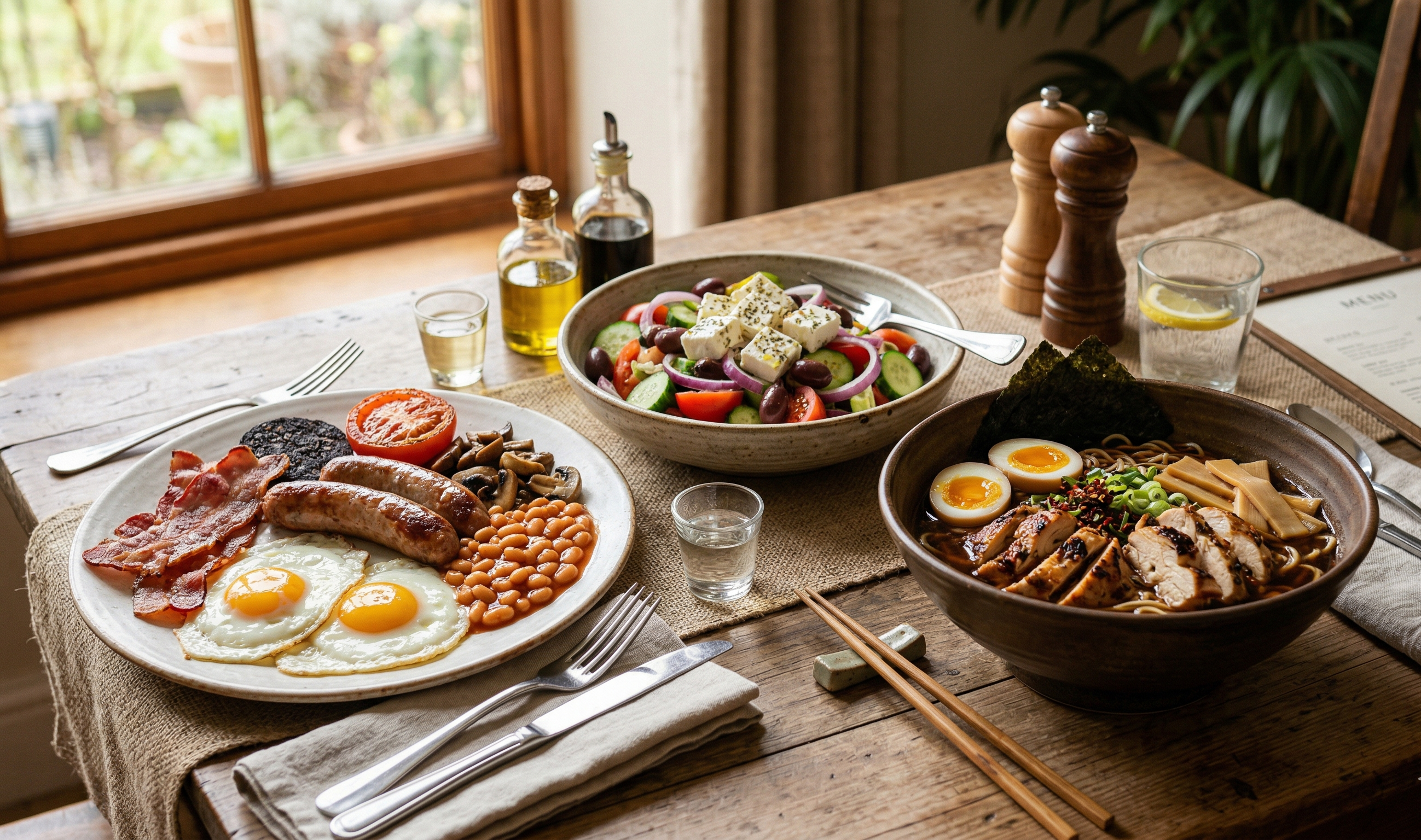 Глазунья, жареные колбаски, фасоль в томатном соусе, шампиньоны, томаты, поджаренный тост