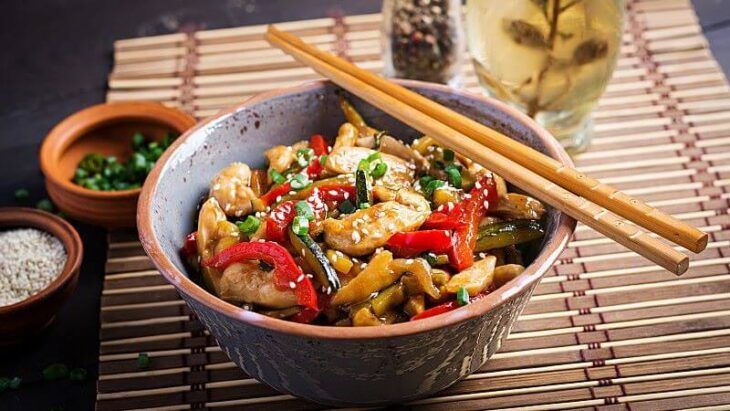 вытянутая лапша, тушеная с мясом и овощами в богатом соусе со специями.