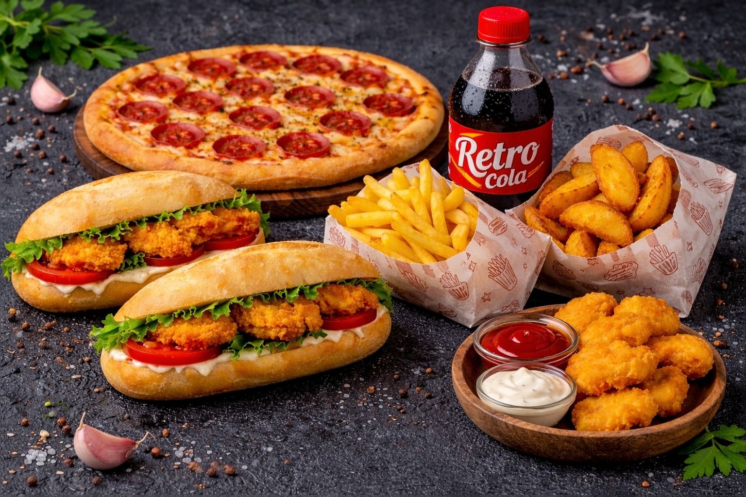 Сэндвичи, наггетсы, кола, фри, картофель по-деревенски