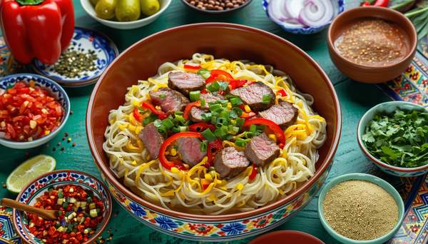 Тянутая лапша, говядина, болгарский перец, морковь, картофель, лук, томатный соус, зелень