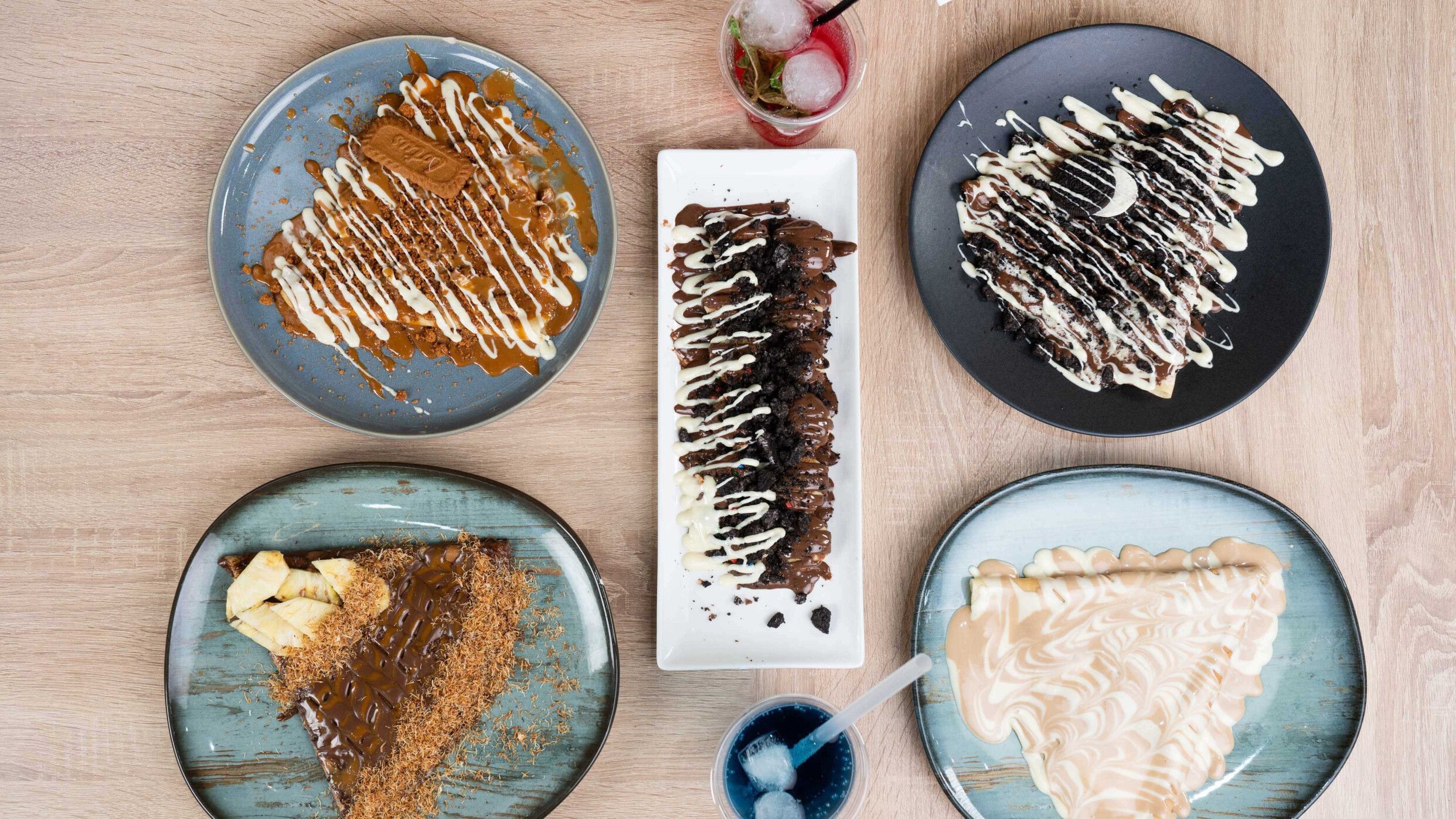 crêpe, oreo, crème cheese fraise / banane, trois chocolats belge