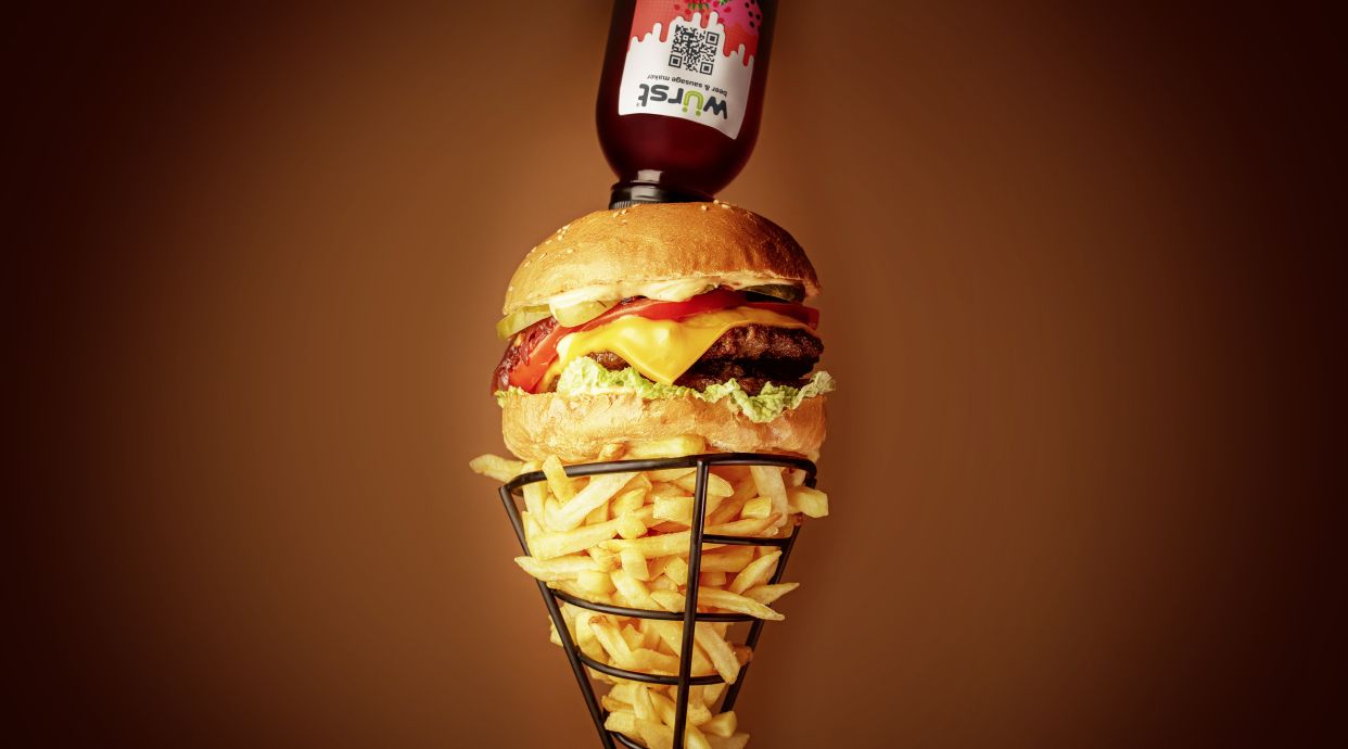 Chiflă Briosche, carne de vită condimentată, becon, salată verde, roșii, ceapă roșie, cașcaval Cheddar, castraveți proaspete, sos Wurst, sos de brânză - 450g