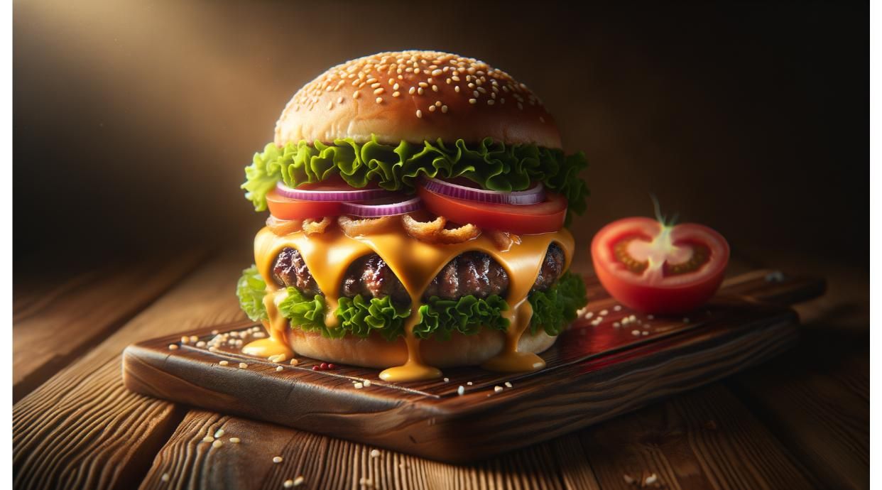 Large juicy beef patty, aromatic bbq jam, pickled red onion, crispy fried onions, and smoky mayo. topped with cheddar cheese, iceberg lettuce, confit tomatoes, and pickles for the perfect flavor explosion! 450g