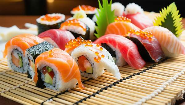 Futomaki z seriolą w tempurze 6 szt. Futomaki z warzywami 6 szt. Futomaki z łososiem i awokado 6 szt. Futomaki z pieczonym łososiem 6 szt. Uramaki z krewetkami w tempurze 8 szt. Uramaki z łososiem owinięte pieczonym węgorzem i krewetkami 8 szt. Uramaki z okoniem w tempurze 8 szt. Hosomaki z ogórkiem 6 szt. Hosomaki z oshinko 6 szt. Nigiri z łososiem 4 szt. Nigiri z krewetką 4 szt.