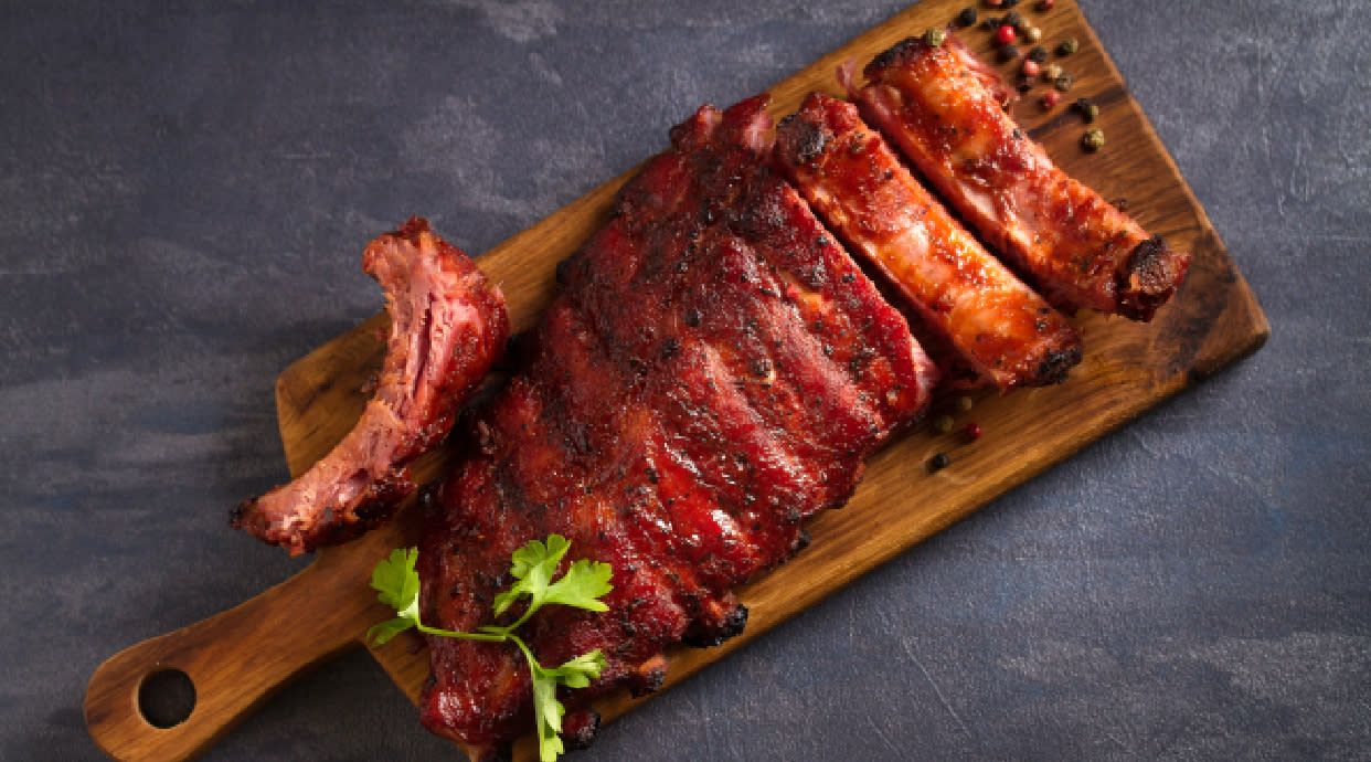 Żebro wieprzowe 500g długo pieczone, , ziemniak pieczony w oliwie, mix sałat, sos bbq