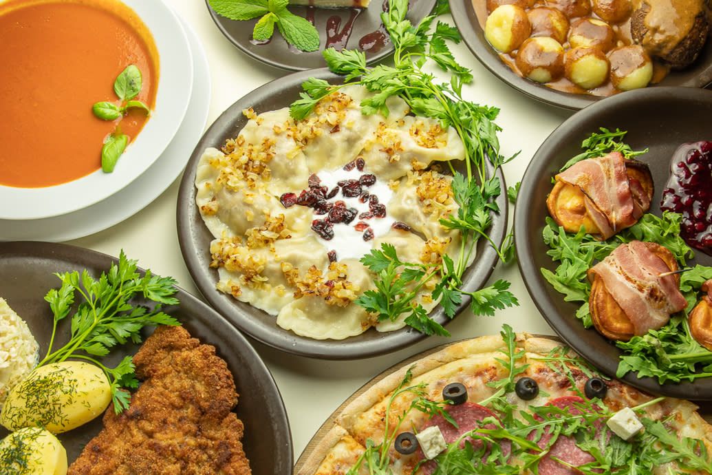Pierogi 8 szt. z mięsem piersi kaczki, żurawina, jogurt naturalny, masełko z cebulką.