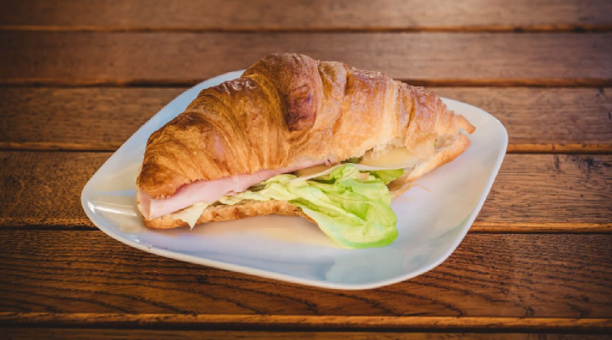 Croissant Daily z szynką sopocką, jajkiem, ogórkiem konserwowym i sałatą rzymską.