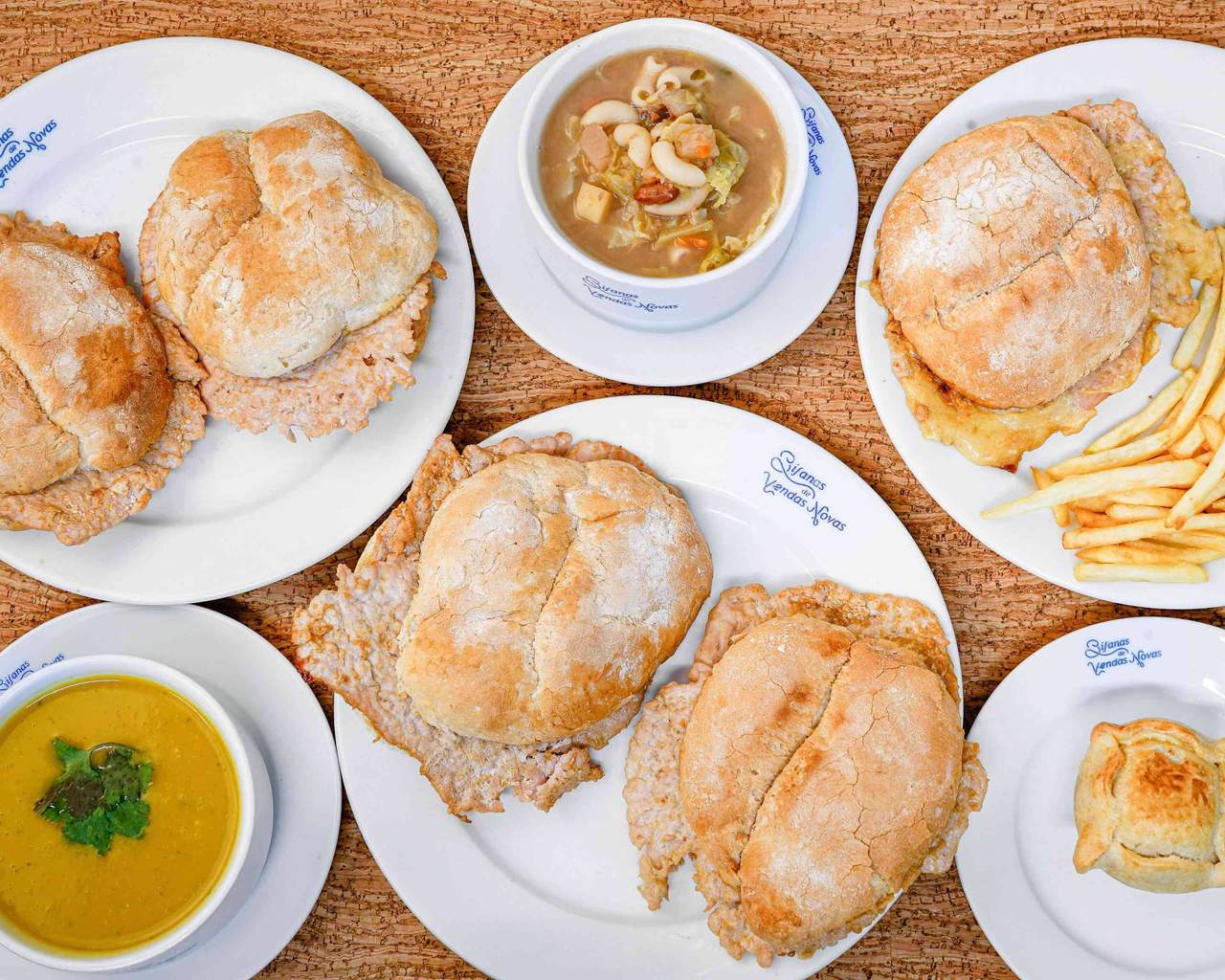 Bifana, sopa (Creme de cenoura, creme de coentros, feijão com legumes, canja de galinha e creme de peixe).