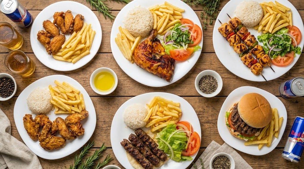 Três espetadas de frango suculentas, grelhadas no carvão, servidas com arroz basmati, batatas fritas crocantes e salada fresca de tomate, alface, cebola e coentros. Inclui uma bebida à escolha.