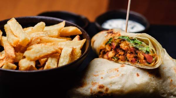 Durum Carnes de tikka, kebab, cebola, tomate e alface e molhos
