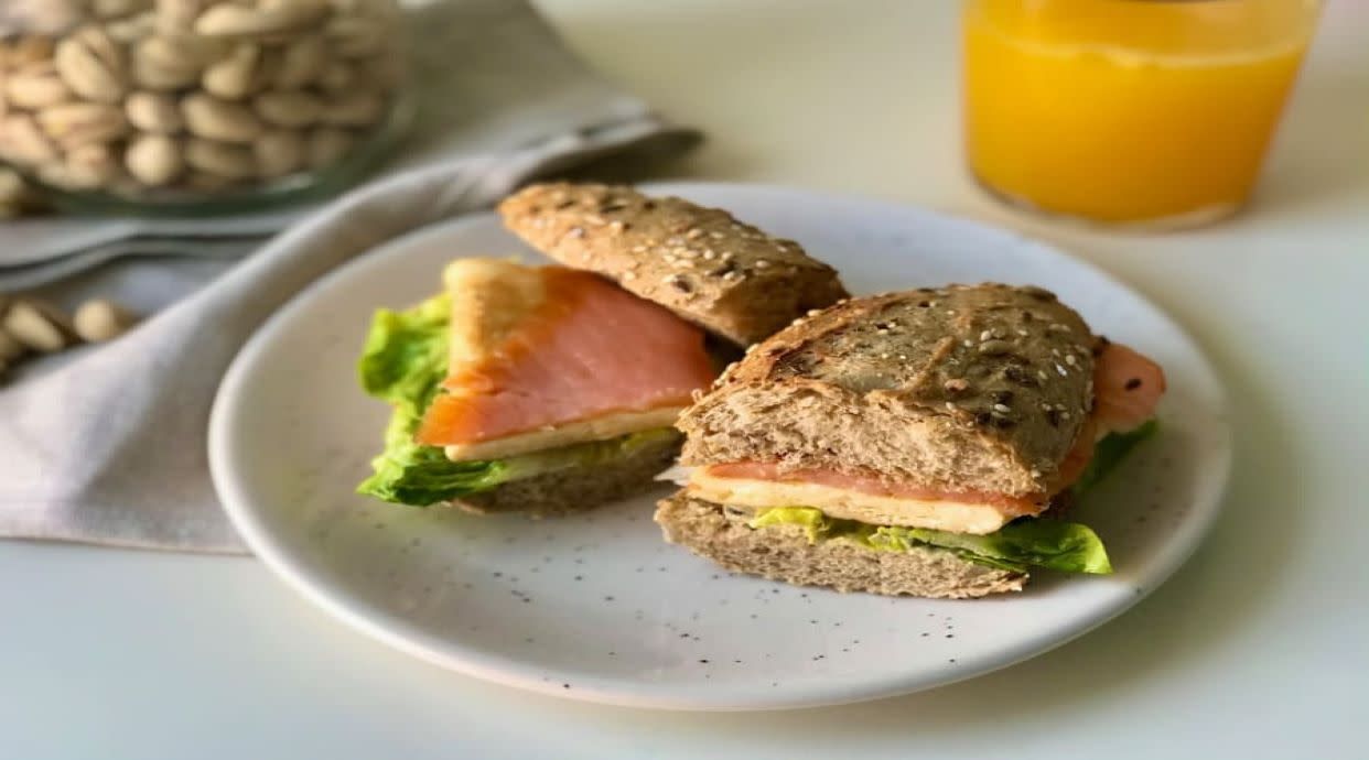 Sumo de laranja ou limonada, pão tostado e ovos mexidos, panquecas 100 Culpa, iogurte vegetal com granola e fruta, e café americano ou infusão.