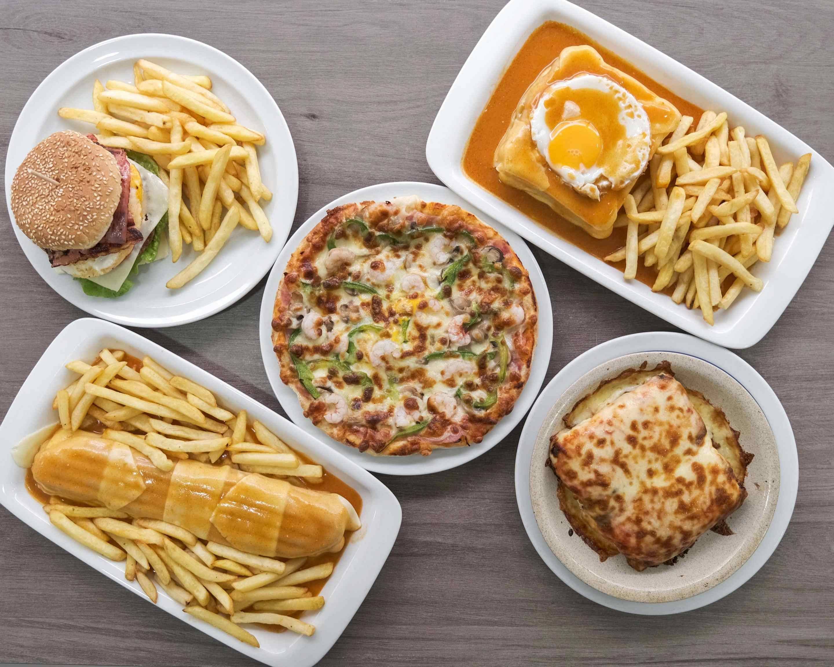 Pão forma, queijo, fiambre, chourição, bife de bovino, ovo, molho de francesinha e batata frita