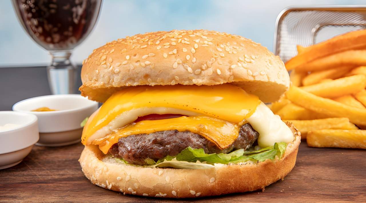 Pão de sementes, maionese de alho, alface, hambúrguer de novilho de 140 gramas, queijo amanteigado e cebola frita. Acompanhado com batatas fritas rodela