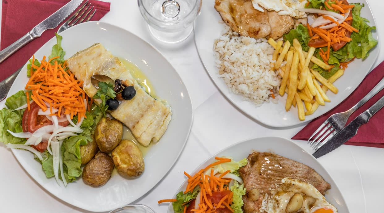 Bife de Novilho, acompanhado de arroz, batata frita e salada.