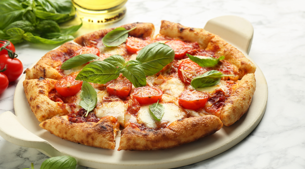 Tomate San Marzano D.O.P, Mozzarella Fior di Latte, fiambre.
