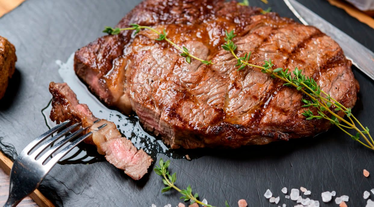 Vitela com Batata Assada, Cogumelos Salteados e legumes. Ideal para quem gosta de pratos de comida aconchegantes. Dose potencialmente suficiente para 2 pessoas