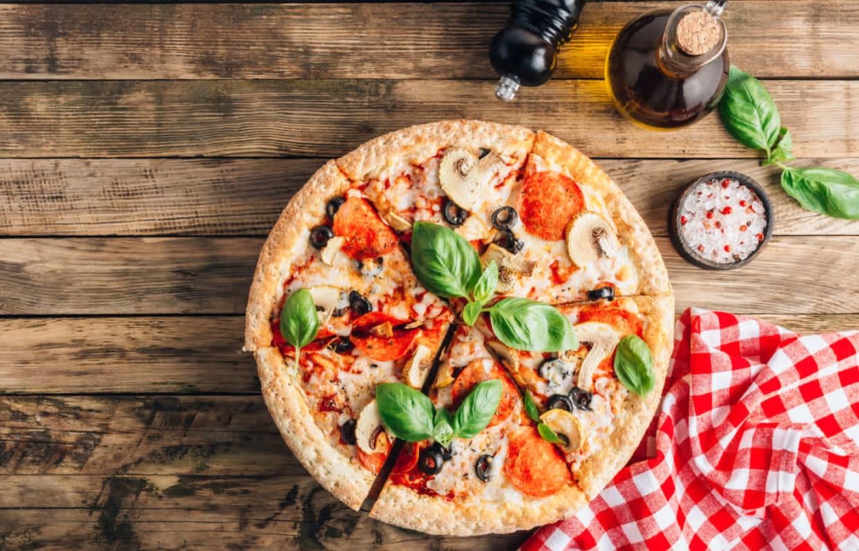 Blat de pizza, fresh mozzarella (100% lapte), sos de roșii, prosciutto cotto, ciuperci proaspete, porumb, ananas - 590g (28cm)