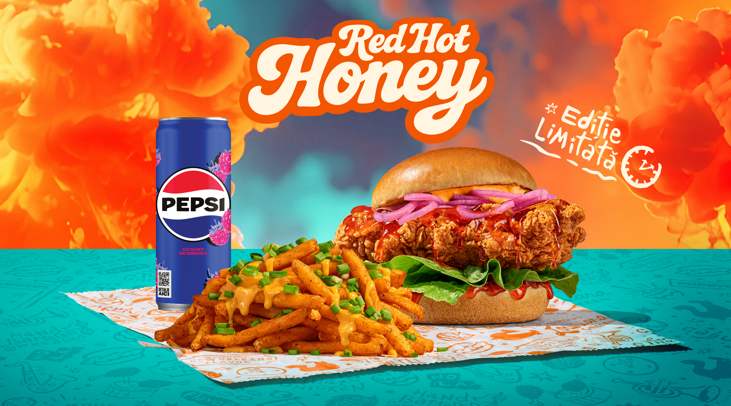 Delivery only: Limited Red Hot Honey Sandwich with our Cheese&Spring Onion Supreme Fries, and a can of refreshing Pepsi Raspberry.