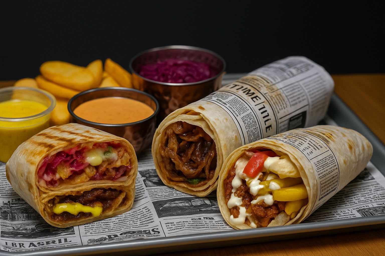 Lipie arabeasca 1 buc, carne pui 180g, sos de rodie 30g, sos garlic 30g, castraveti murati 30g, cartofi dollar chips 125g, varza rosie 50g