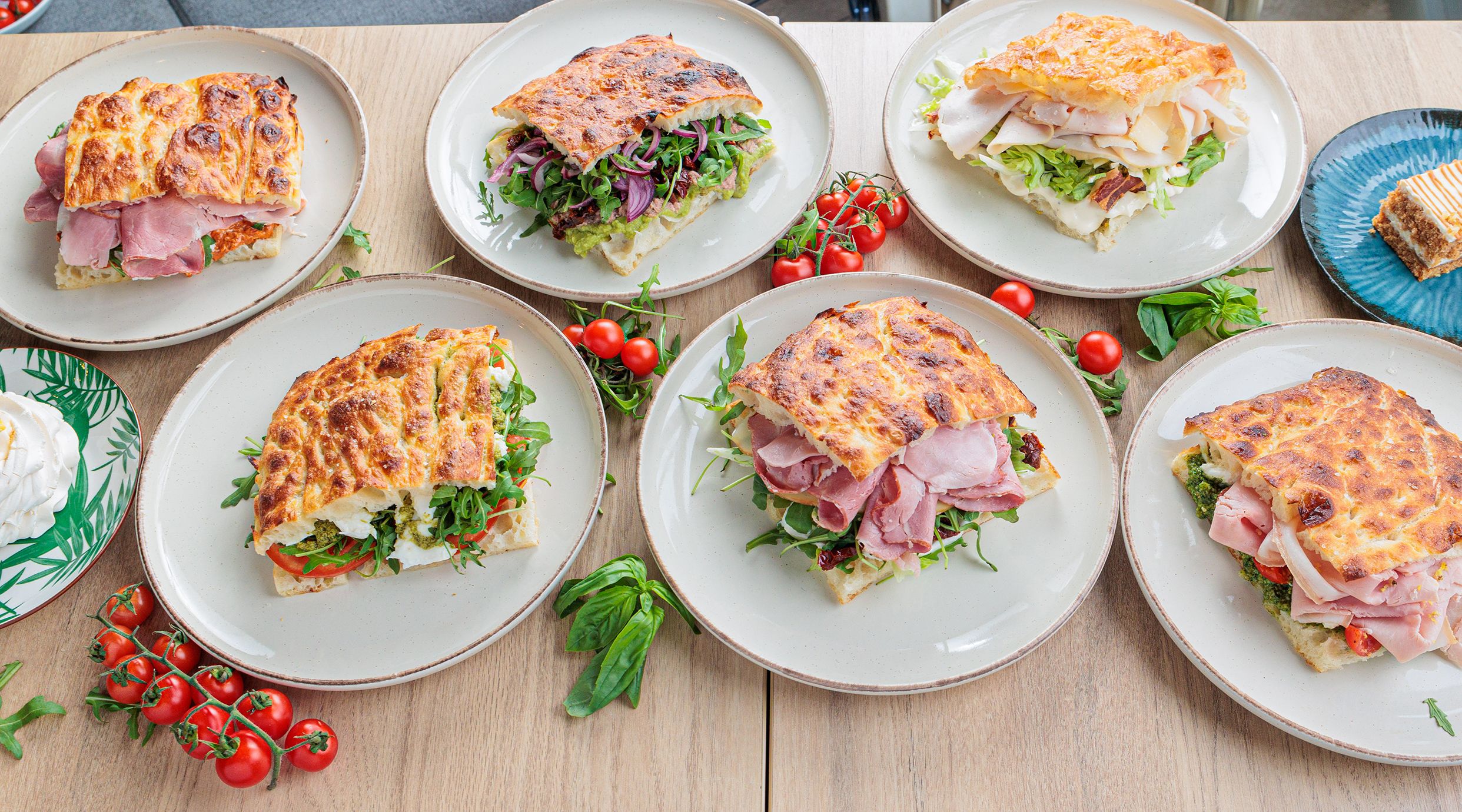 Burata, pršut, pesto sos, paradajz.
