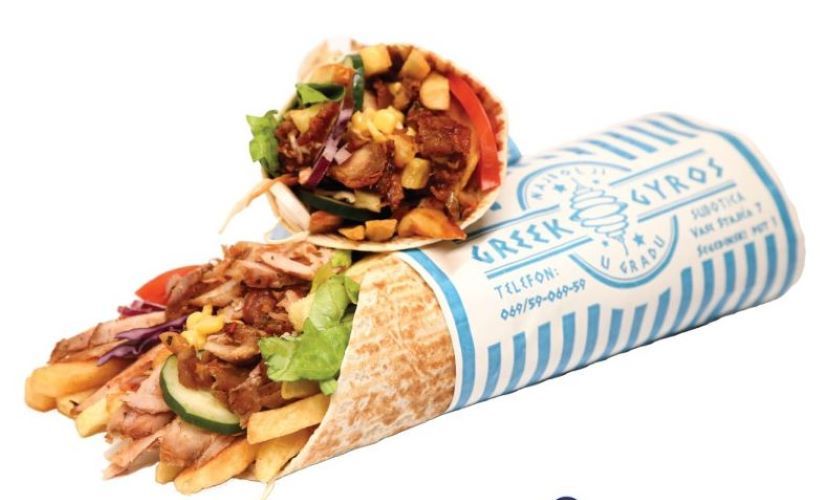 Gyros meso 600 grama, 4 lepinje, pomfrit 400 grama, caciki sos, salata