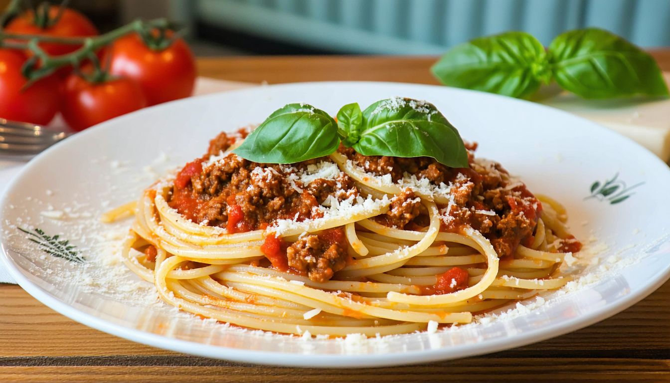 Pâte spaghetti, sauce tomate, poivrons, viande hachée
