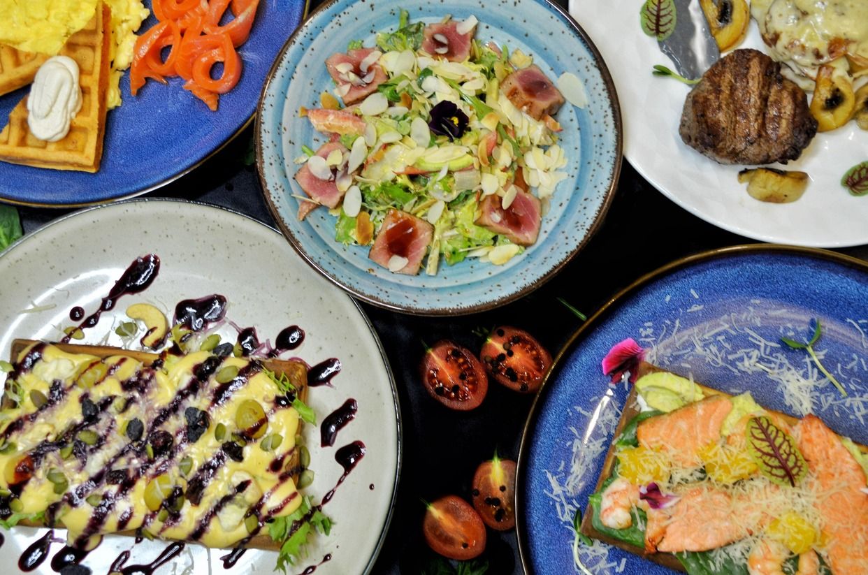 Лосось гравлакс, сирний соус, Томатна вафля, пікантний Том ям соус, бебі Моцарела, соус Песто та яйце пашот
