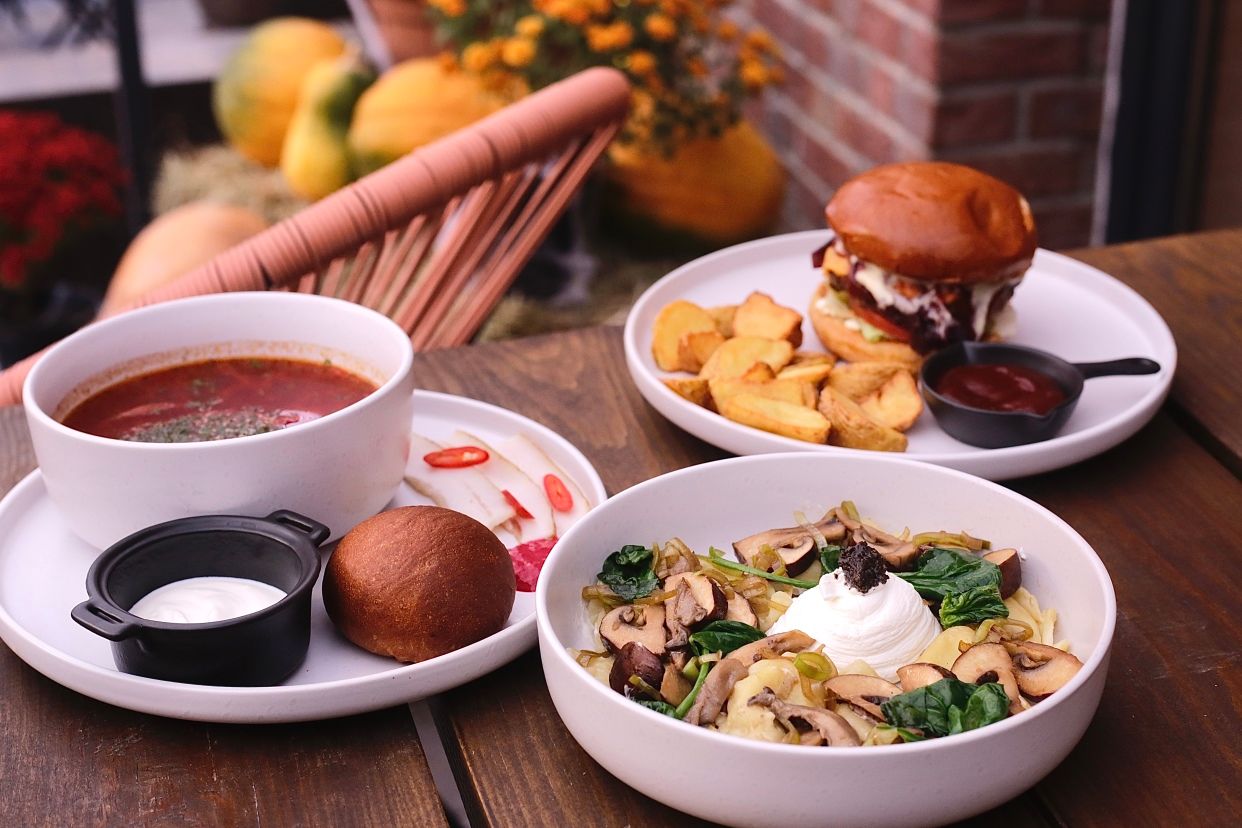 1. Курячий бульон з яйцем та грінками (380г) 2. Стейк Pork з медово-гірчичним соусом, картоплею та битими огірками (350г)