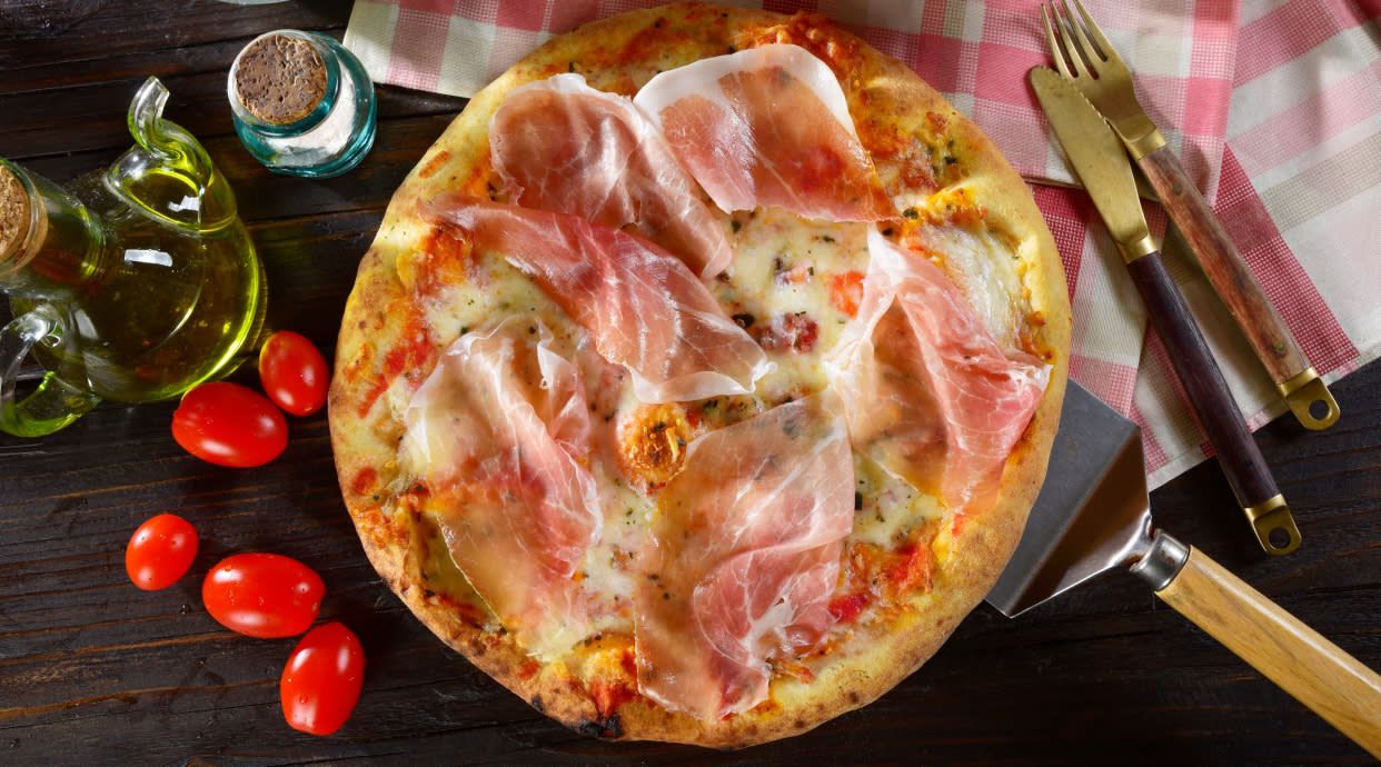 Тісто, неаполітанський соус, сир моцарела, шинка, печериці, оливки, ароматна олійка