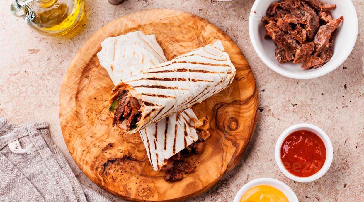 Жовтий лаваш з борошна, яловичина маринована в авторському маринаді, соус Білий, підсмажений бекон, свіжий помідор, печериці, салат Айсберг, картопля фрі, маринований огірок