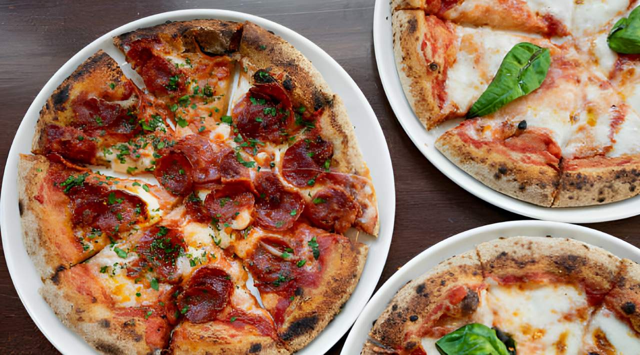 Перетерті томати, сир моцарела, домашня ковбаска, запечений перець, гриби, рукола