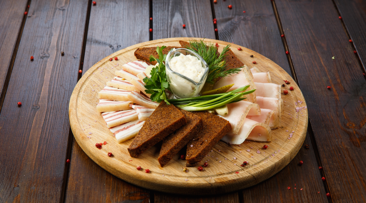 Асорті сала з грінками з бородинського хліба та вершковим хріном