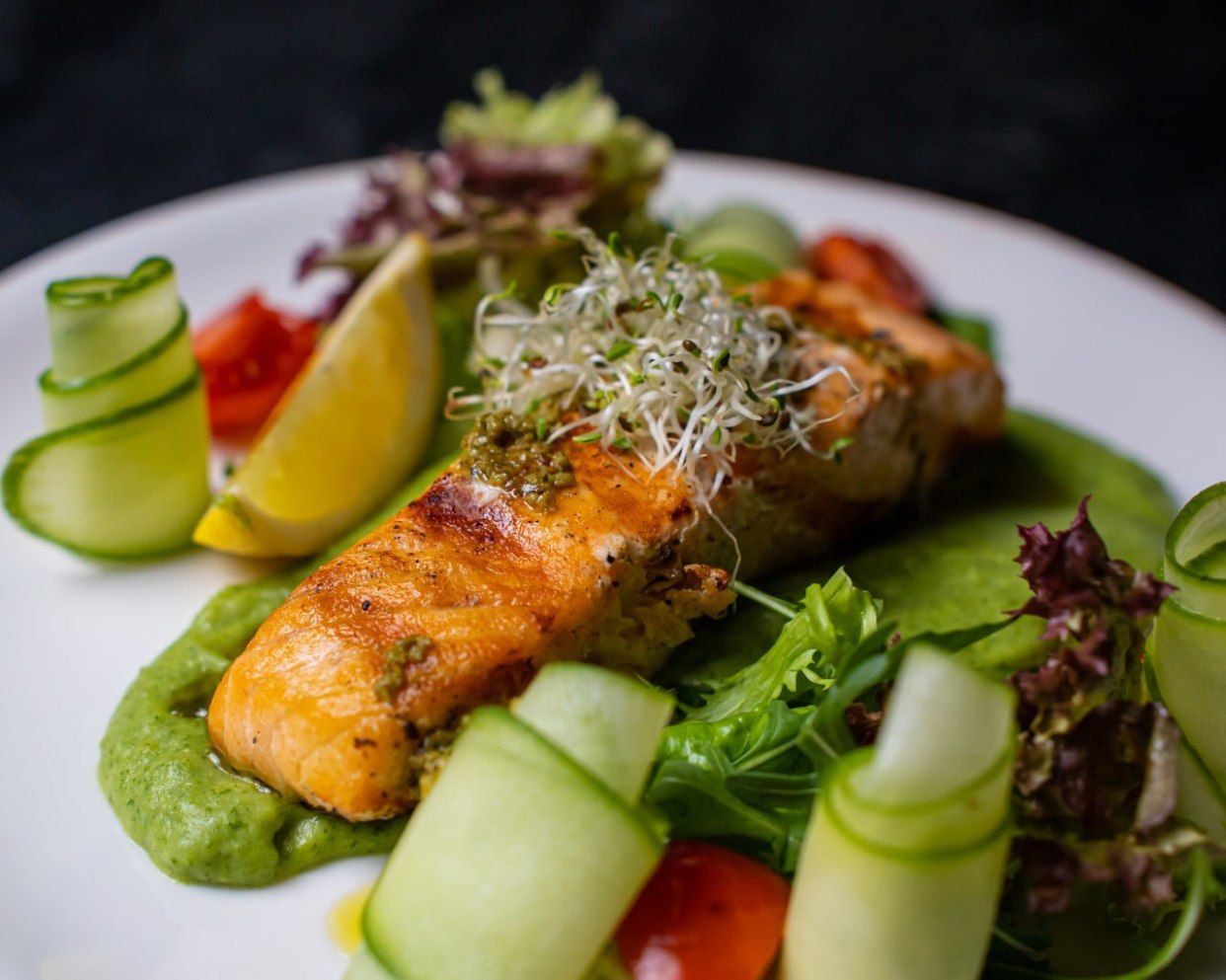 Філе лосося приготовлене на хоспері. Подається з соусом Тартар , листям салату, томатом та лимоном 100 г/90 г