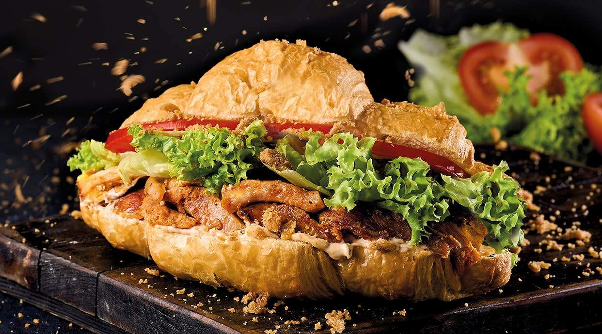 Круасан, помідор, огірок, курятина, гриби Печериці, листя салату, соус Цезар
