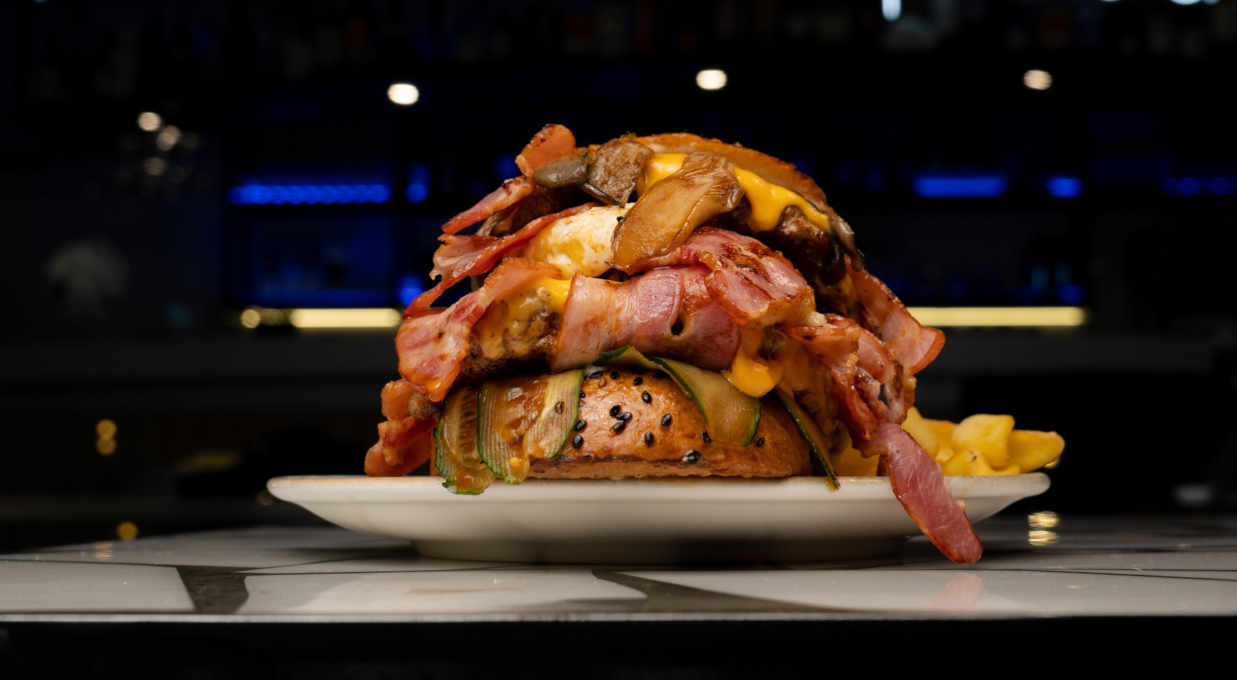 Смешбургер з яловичою котлетою, беконом, смаженим яєчком та свіжим зеленим салатом.
