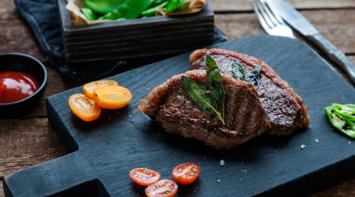 Trakice bifteka 250g u maslinovom ulju, sa domaćinskim krompirom i polovina domaćeg somuna 150g