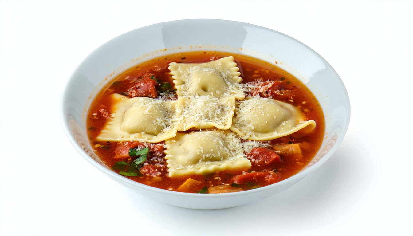 Potage de carrés de pâte remplis d'une farce à base de viande, de légumes et de fromage
