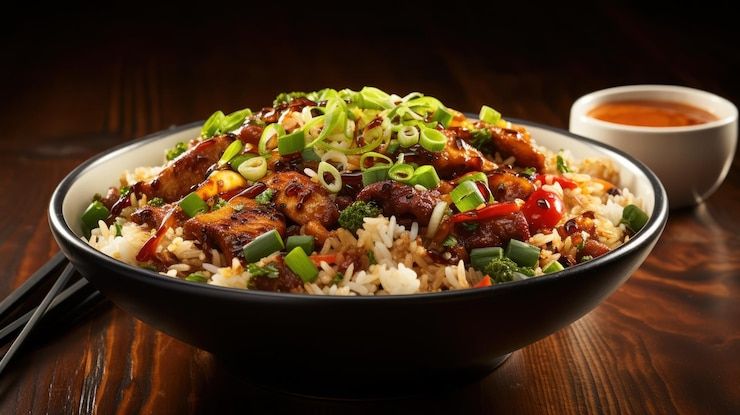 Plat de riz assaisonné et cuit avec des cuisse de poulet